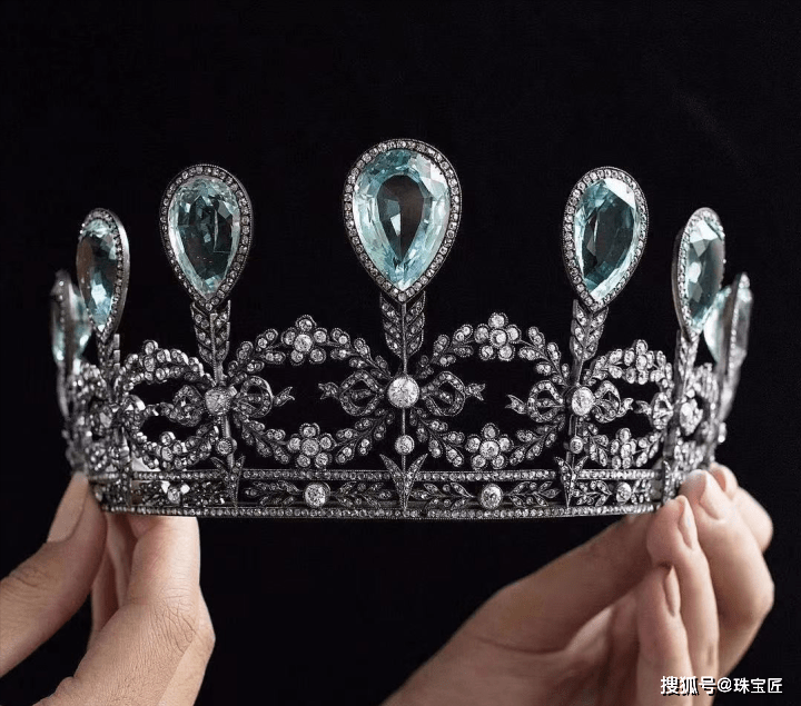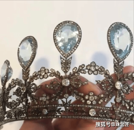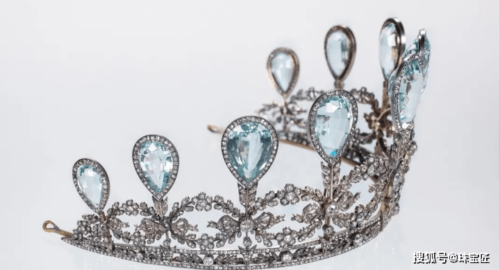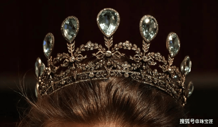 这顶冠冕是由海蓝宝石和钻石镶嵌而成,其中,位于冠冕顶端的9颗水滴形海蓝宝石最为醒目。
