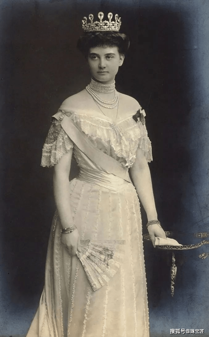 1904年7月,亚历山德拉身穿粉色丝绸晚宴裙,头戴FABERGÉ海蓝宝冠冕出席了皇室舞会。