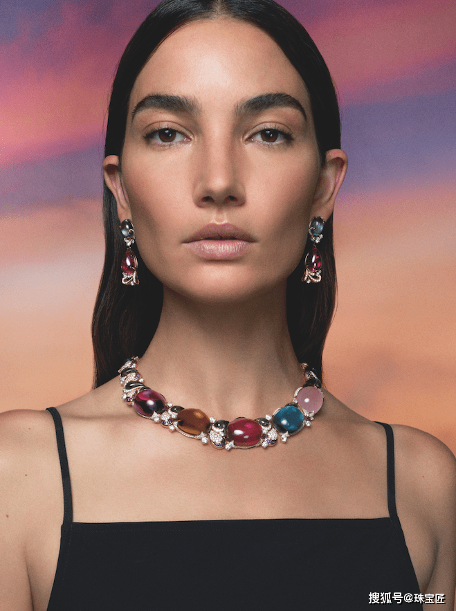 不仅用色大胆,宝格丽还从罗马建筑的圆形拱顶中汲取灵感,素面宝石成为品牌的标志性元素,彰显宝石明亮艳丽的色彩搭配。