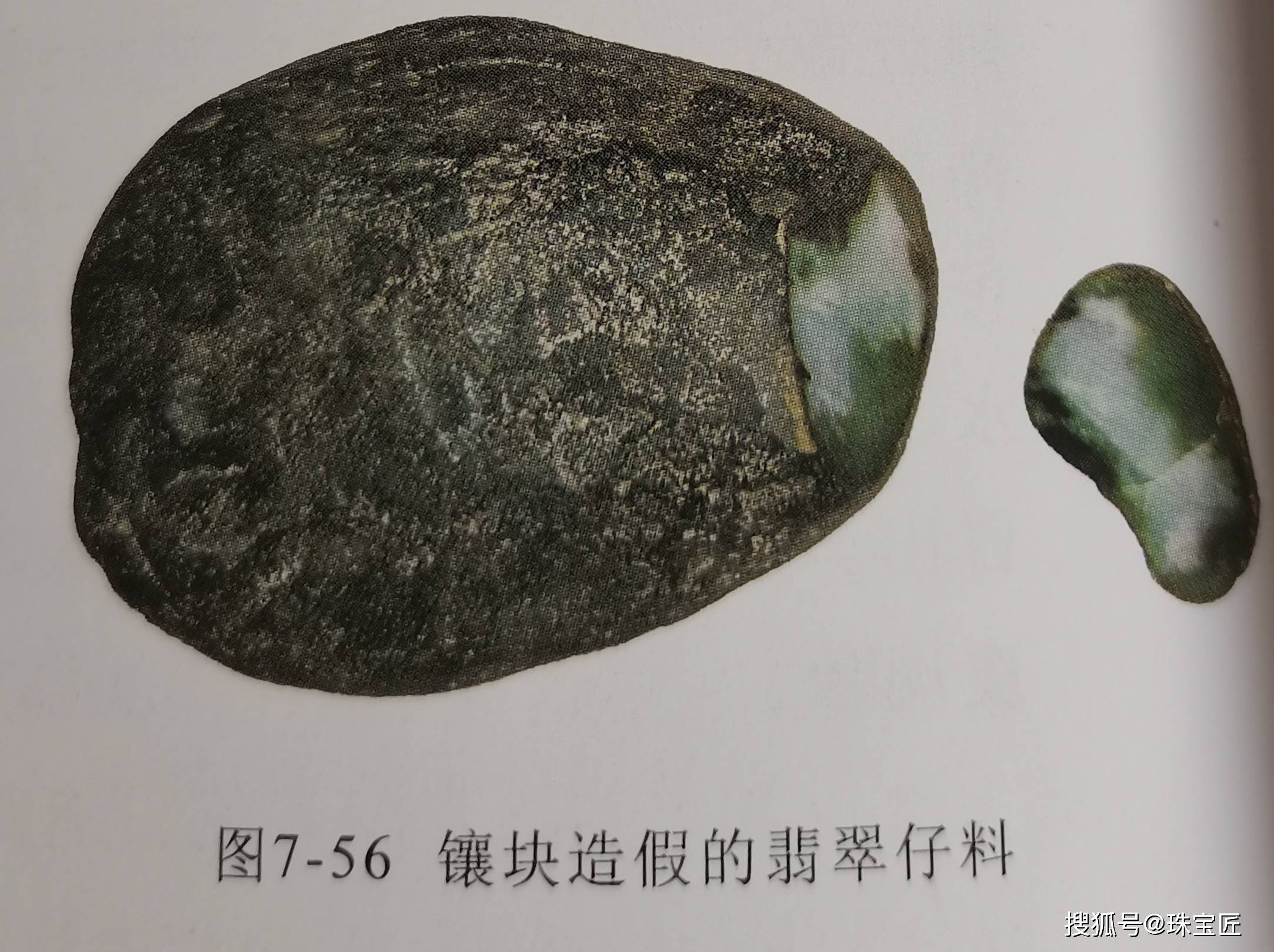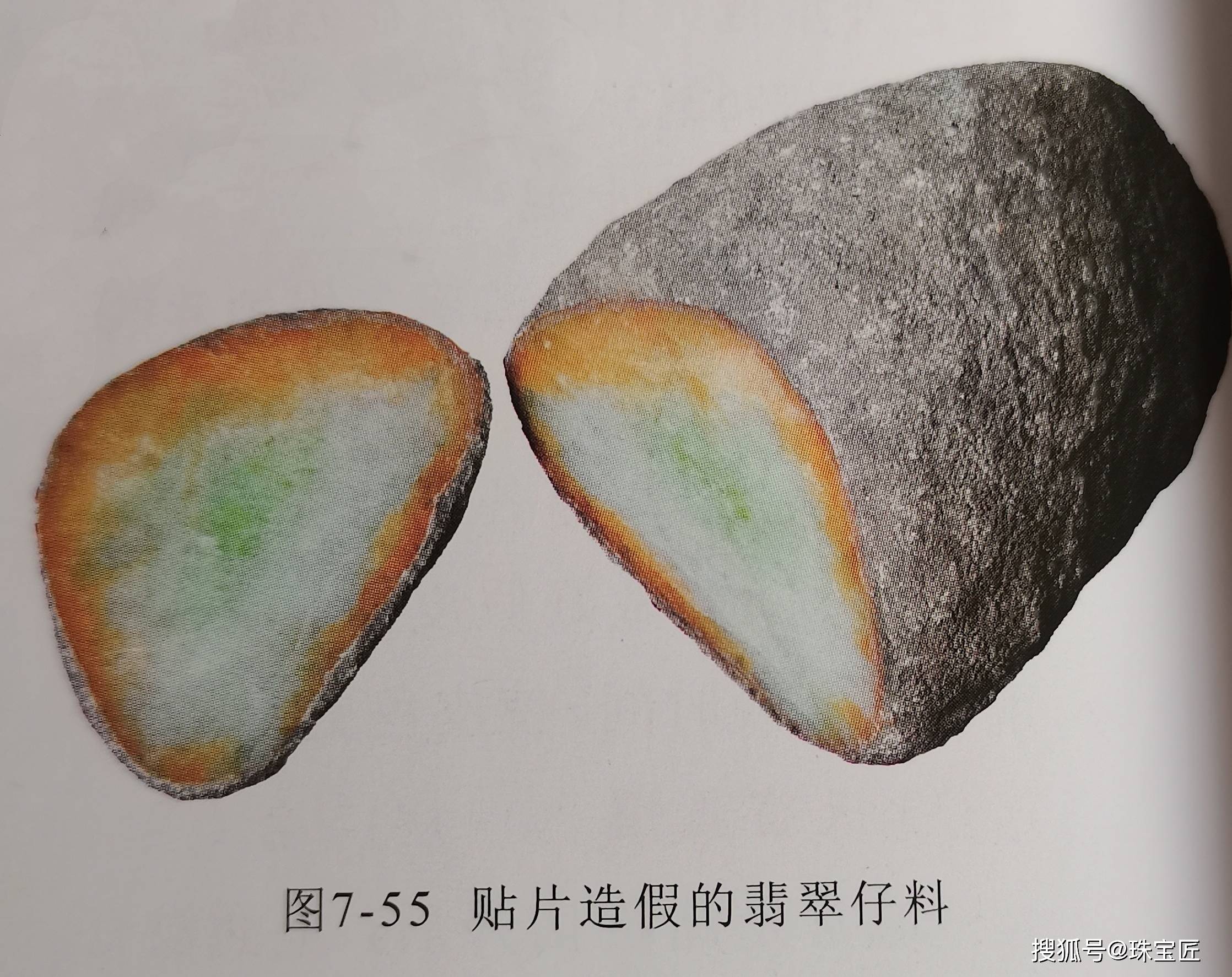 在原石的开口和盖子分别贴上一层高质量的(水好、色好)的翡翠薄片,再在黏接处做上假皮掩盖,这种作假手段业内叫做“贴片假口”。