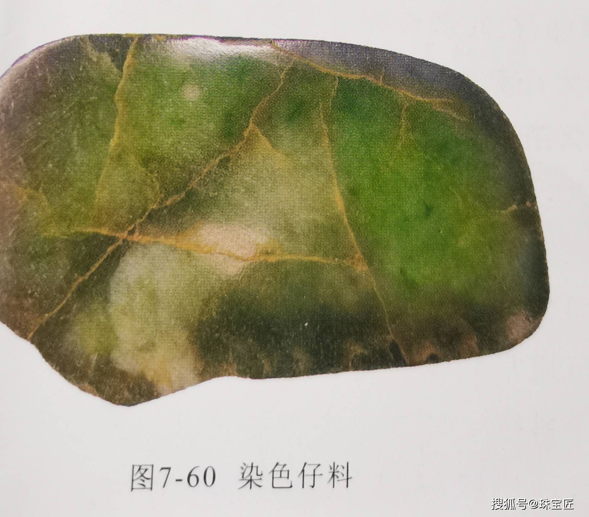 辨别这种染色翡翠可以放大观察,会看到颜料在原石的裂隙中富集,在查尔斯滤色镜下变色等染色的特征。