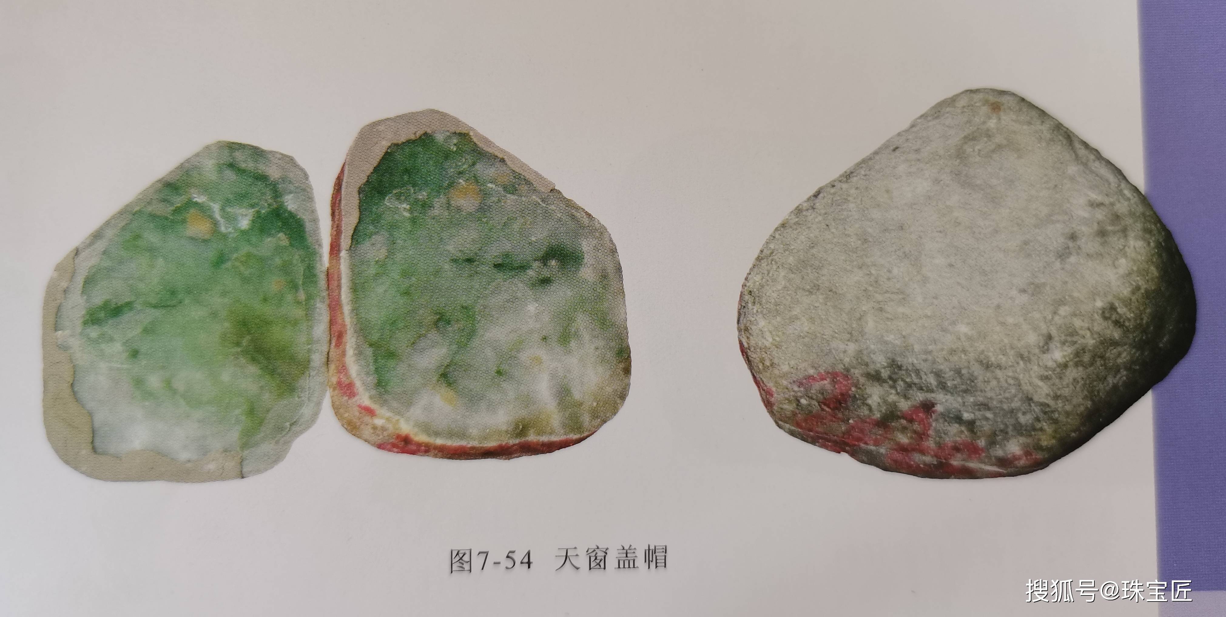 天窗盖帽:指切开后内部玉质劣质的翡翠原料,将开口处做假皮掩盖缝隙,或直接将切开的翡翠原位拼接,接合缝处做假皮掩盖。