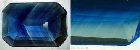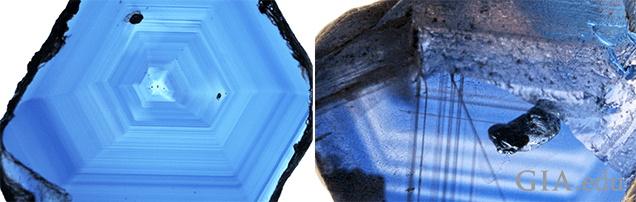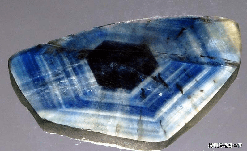 由于蓝宝石的晶形为六方柱状,所以宝石内的六方生长色带实际上反映了宝石从小到大的生长轨迹。不同产地的蓝宝石色带规律显示出的生长区、颜色区和内部出现的锆石晶体变化的差异规律都不相同。