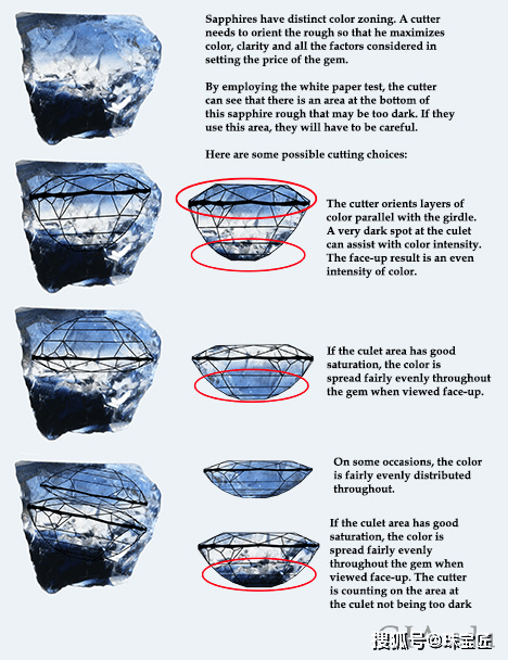 这种色带致色的蓝宝石,对切割师傅要求很高。经验丰富的切割师会将色带平行于腰围,或在尖底处保留少量颜色集中且浓郁的色带(视觉上美化台面观察的颜色)。