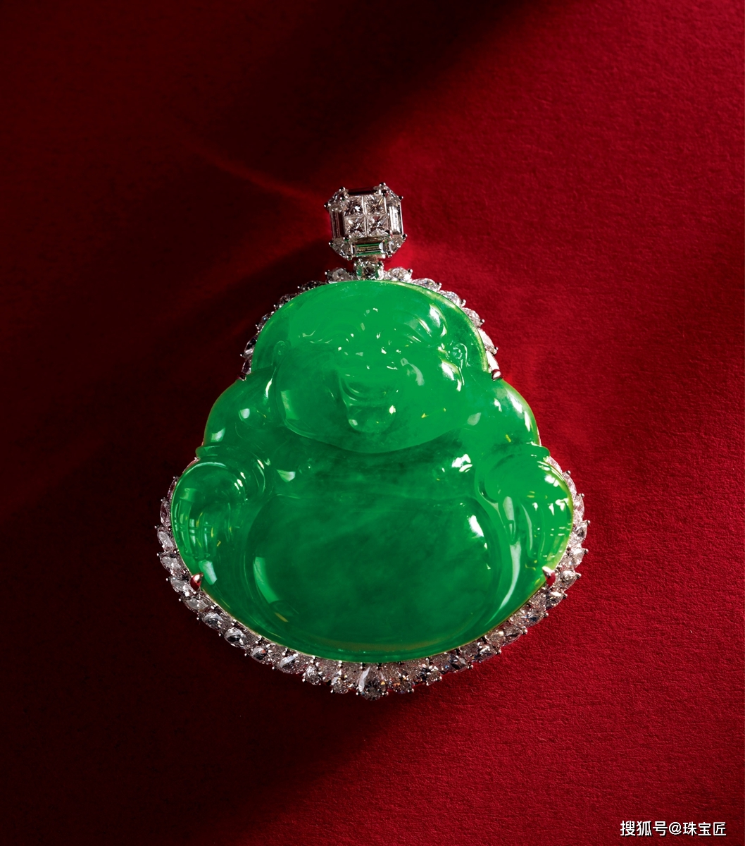 18k金镶满绿饱满佛公吊坠,颜色浓阳绿,有胶质感,尺寸约43.6×45×8mm,重约63.07克,附证书。