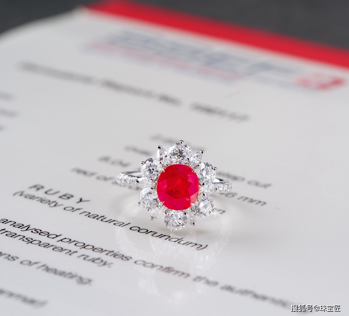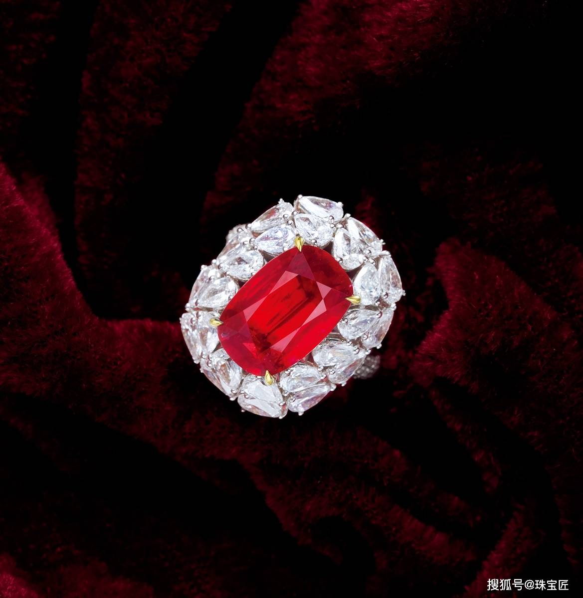 18k金镶无烧鸽血红红宝石戒指,主石产地莫桑比克,未经加热处理,尺寸14.25×9.35×5.79mm,重约10.4克,戒圈13,附GRS证书。