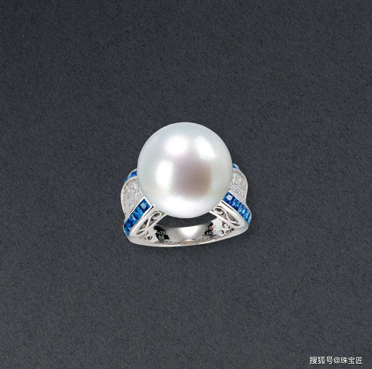 18k金镶海水珍珠配蓝宝石戒指,两边蓝宝石流线型镶嵌,大气高贵,海水珍珠尺寸约16mm,总重约12.55克,戒圈14。