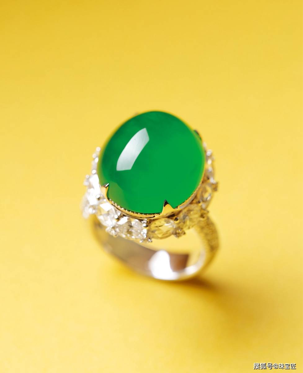 18k金镶冰种翡翠蛋面戒指,翡翠饱满,颜色浓郁,翡翠尺寸为15×18×9mm,重约13.97克,戒圈14,附证书。