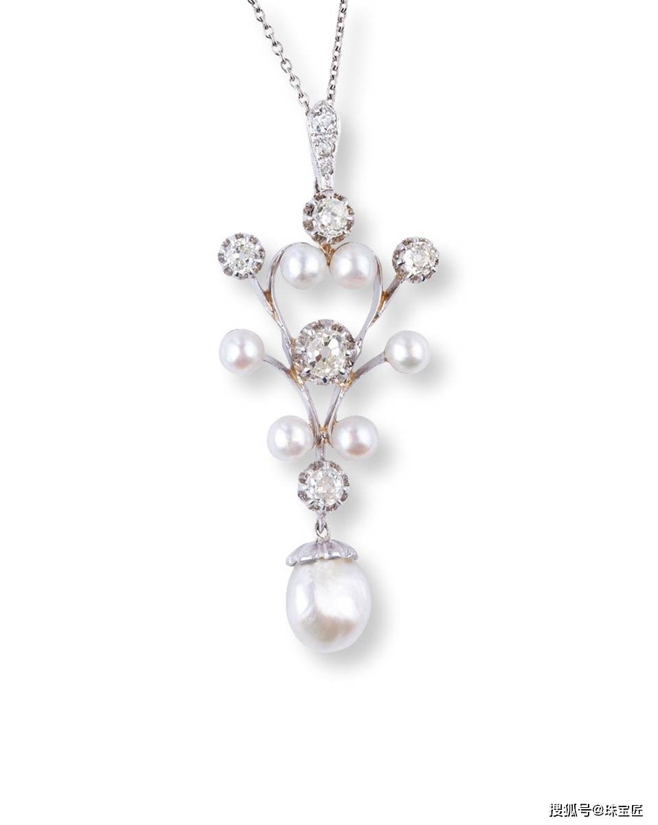 铂金钻石野珠项链吊坠,野生珍珠尺寸约4.3-8.7mm,吊坠尺寸53×22mm,重约13.22mm,以1克拉老欧切钻石作为点缀,附证书。