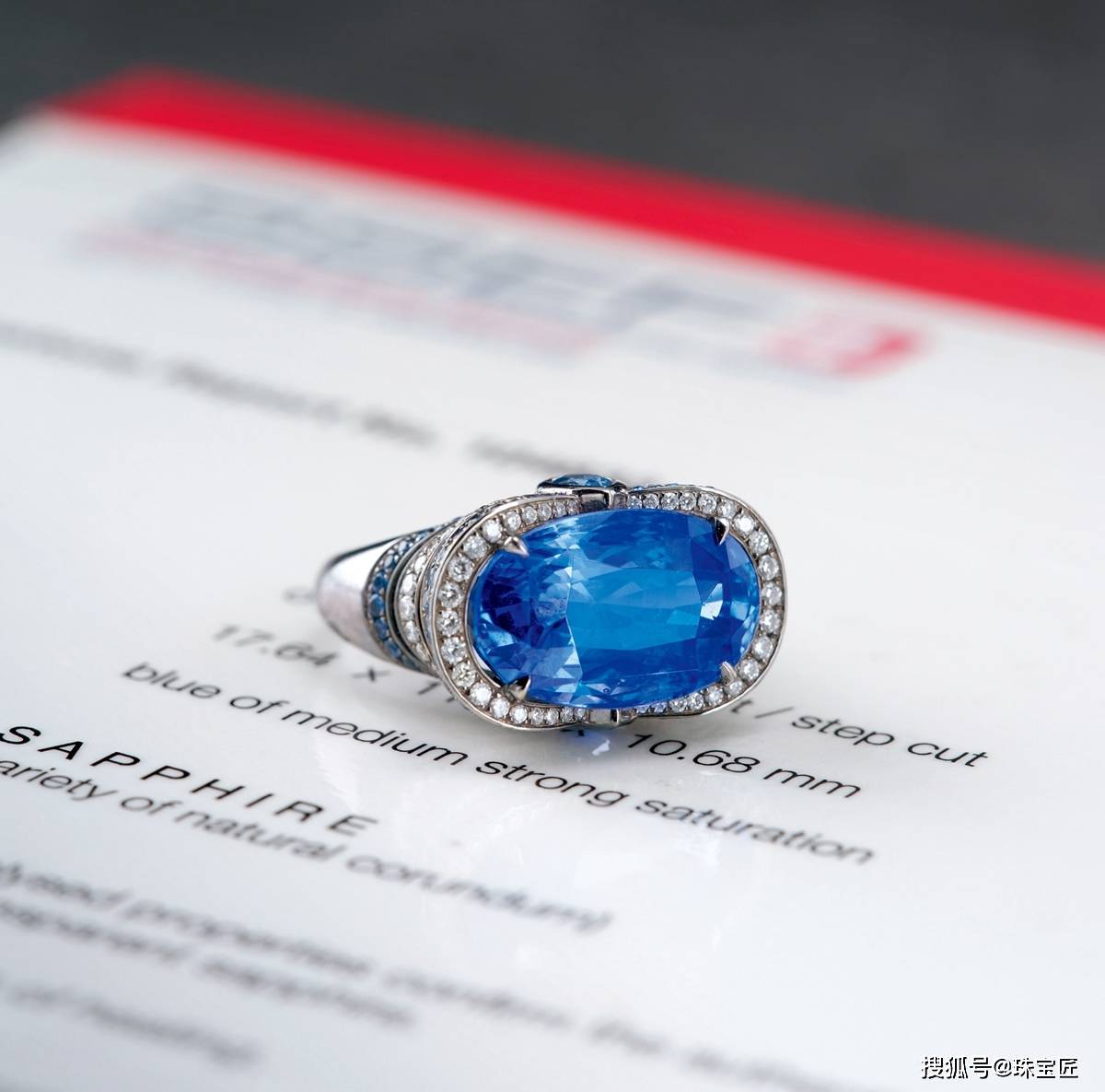 18k金镶19.401克拉蓝宝石戒指,主石产自缅甸,设计独特,尺寸17.64×11.30×10.68mm,重约15.8克,戒圈14,附ssef证书。