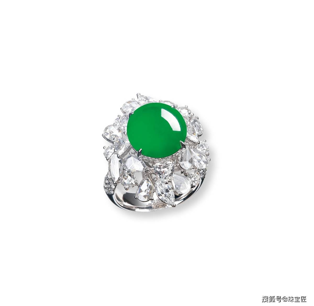 18k金镶满绿蛋面戒指,呈阳绿色,色泽亮丽,翡翠裸石尺寸14.7×16.7×5.3mm,重约13.93克,戒圈13,附证书。