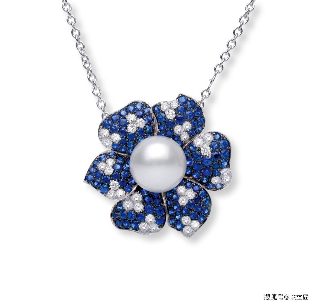 “盛开Blossom”15.5mm澳白珍珠吊坠,链长450mm,花蕊部分镶嵌了一颗直径达15mm、品质上乘、拥有完美“珠光”光泽的珍贵白色南洋珠,而花瓣上则镶满了璀璨的钻石和沉稳的蓝宝石,拿掉链子还可以作为胸针来佩戴。
