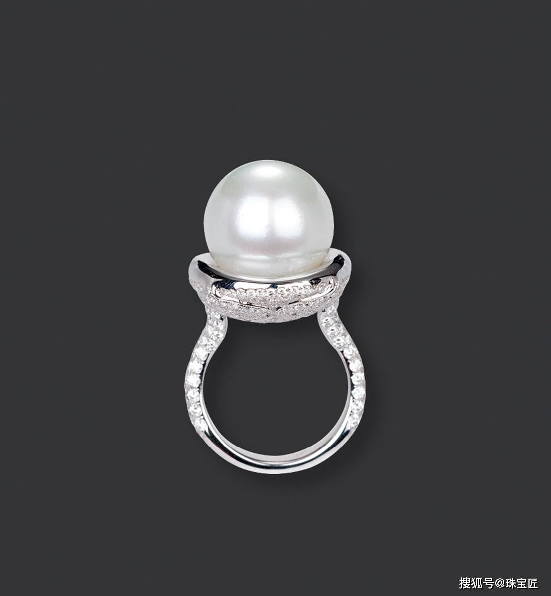 18k金镶海水澳白珍珠配钻石戒指,重约17.83克,戒圈13,珍珠尺寸15.8mm,戒托为钻石镶嵌,造型大气高贵。