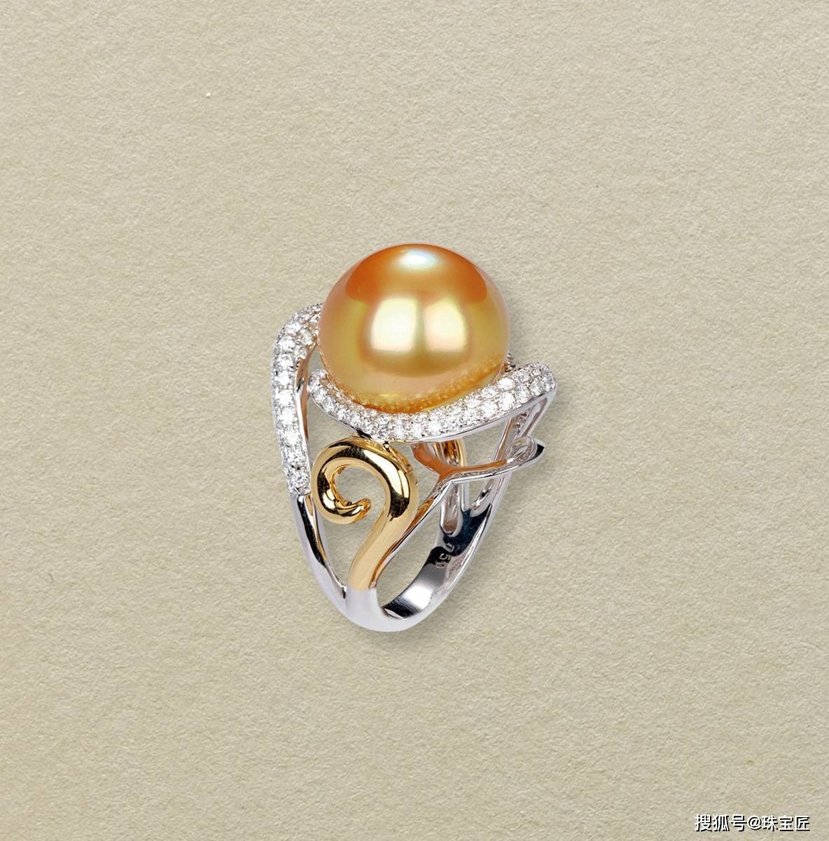 18k金镶浓金珍珠戒指,祥云腾舞,珍珠尺寸15.8mm,总重约14.76克,戒圈13。