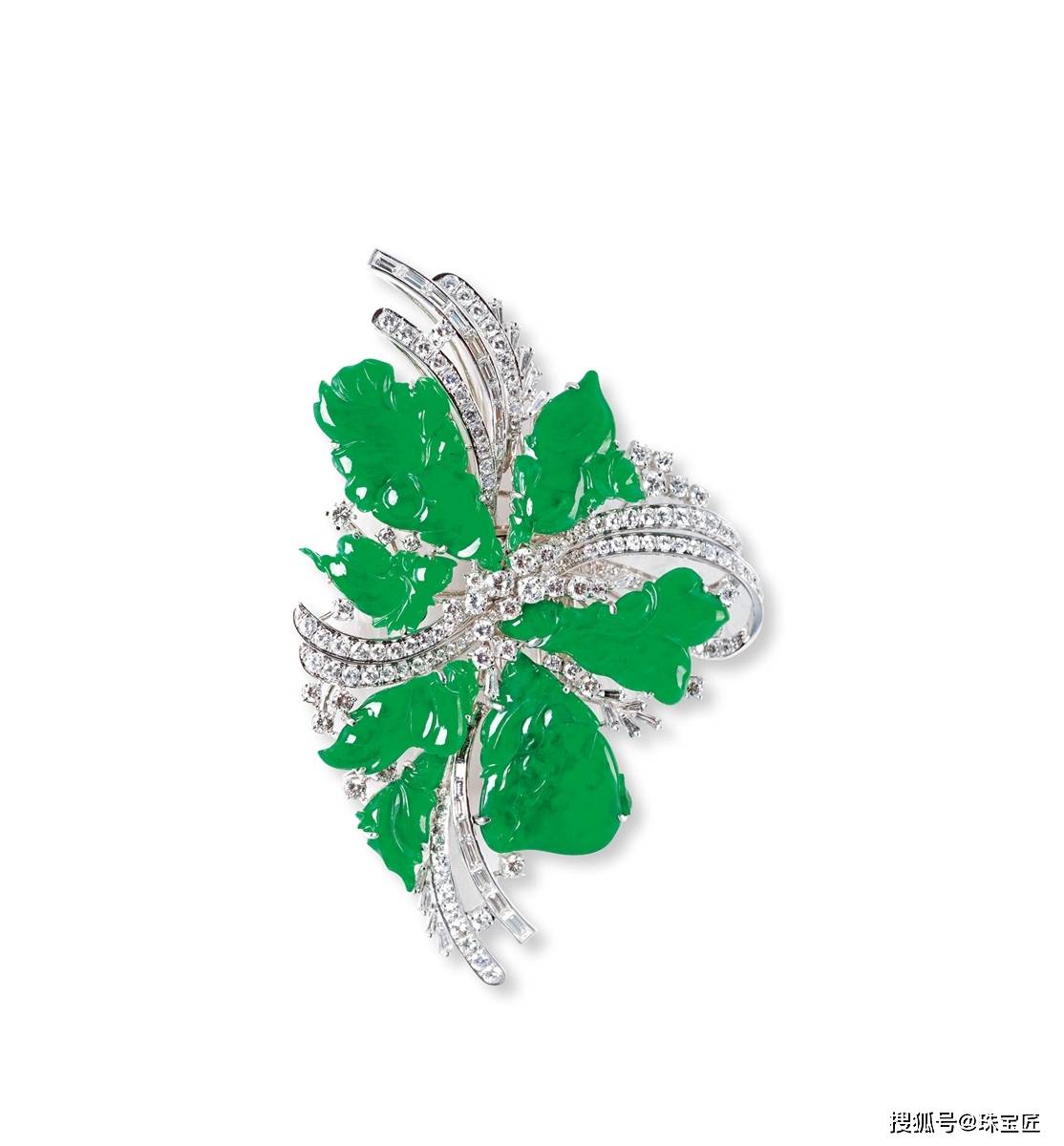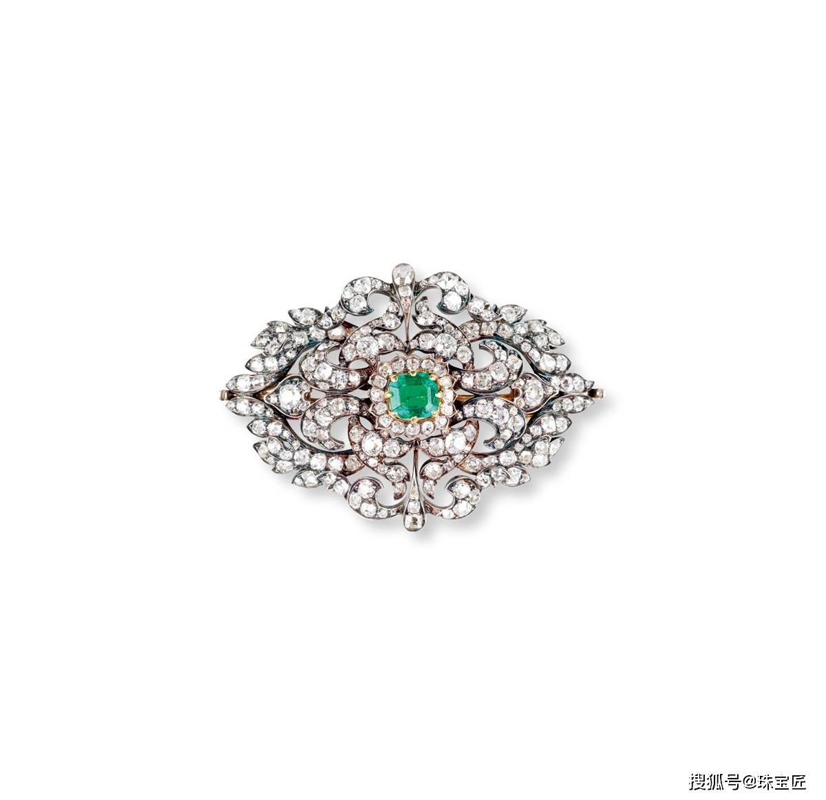 18k金镶祖母绿配钻石胸针,工艺精湛,胸针尺寸约39.8×58.2mm,总重约20.62克,附原盒。