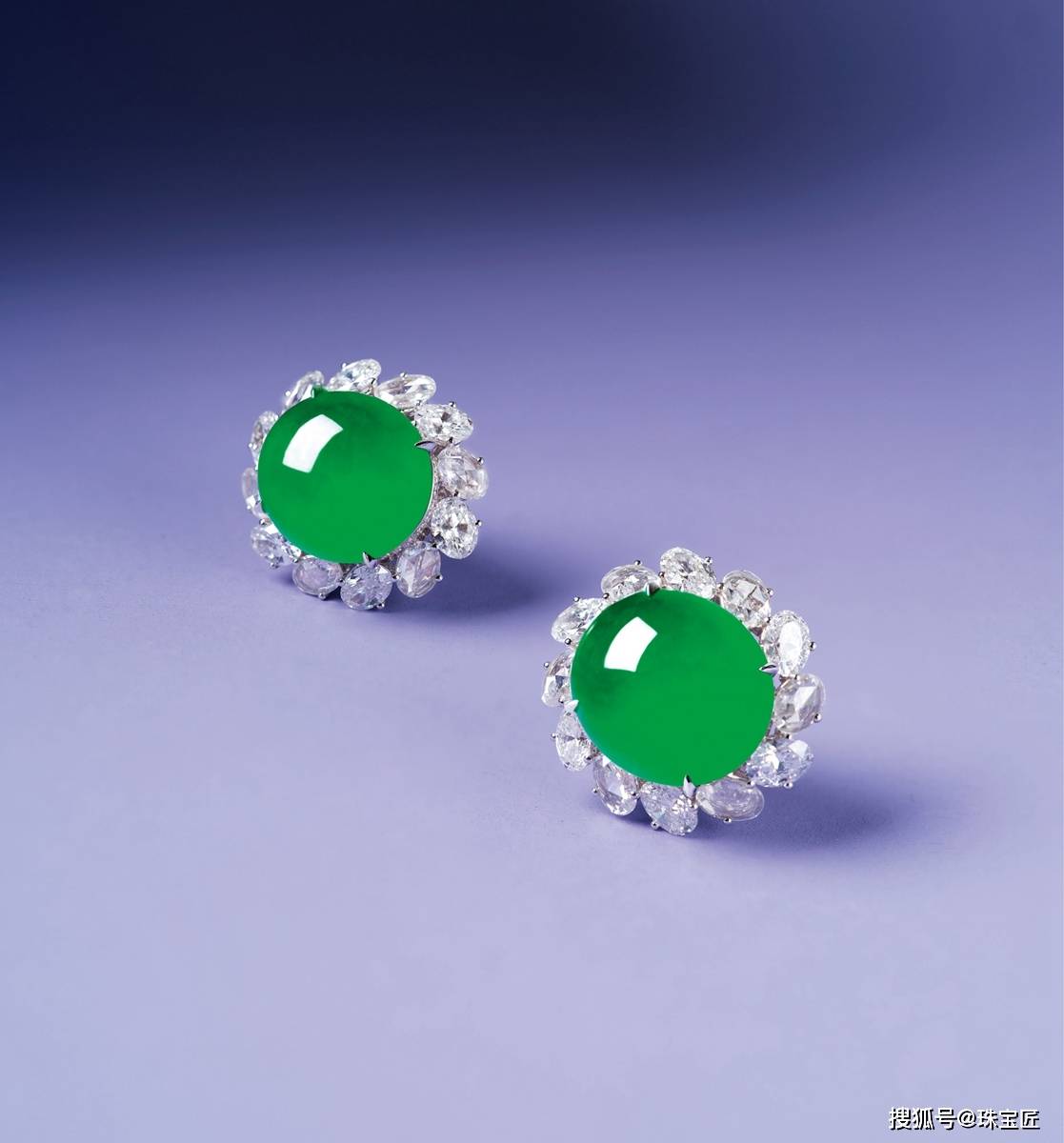 18k金镶满绿蛋面耳钉,翡翠饱满,色泽浓郁,种水俱佳,翡翠裸石尺寸16×14.3×2mm,重约21.39克,附证书。