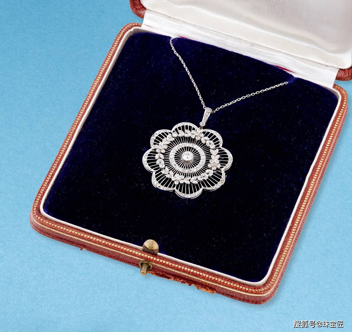白金钻石项链,主石为钻石,重3克拉,四周采用轨道镶嵌红宝石,尺寸约29.7×42.3mm,重约13克,附原盒。