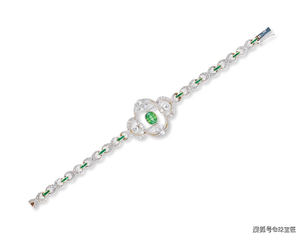 铂金黄金叠打翠榴石钻石手链,金镶1克拉翠榴石手链,主石是一枚极其少见的乌拉尔山翠榴石,两颗老欧切,主钻石0.8克拉,玫瑰切钻石3克拉,长度17mm,附证书。