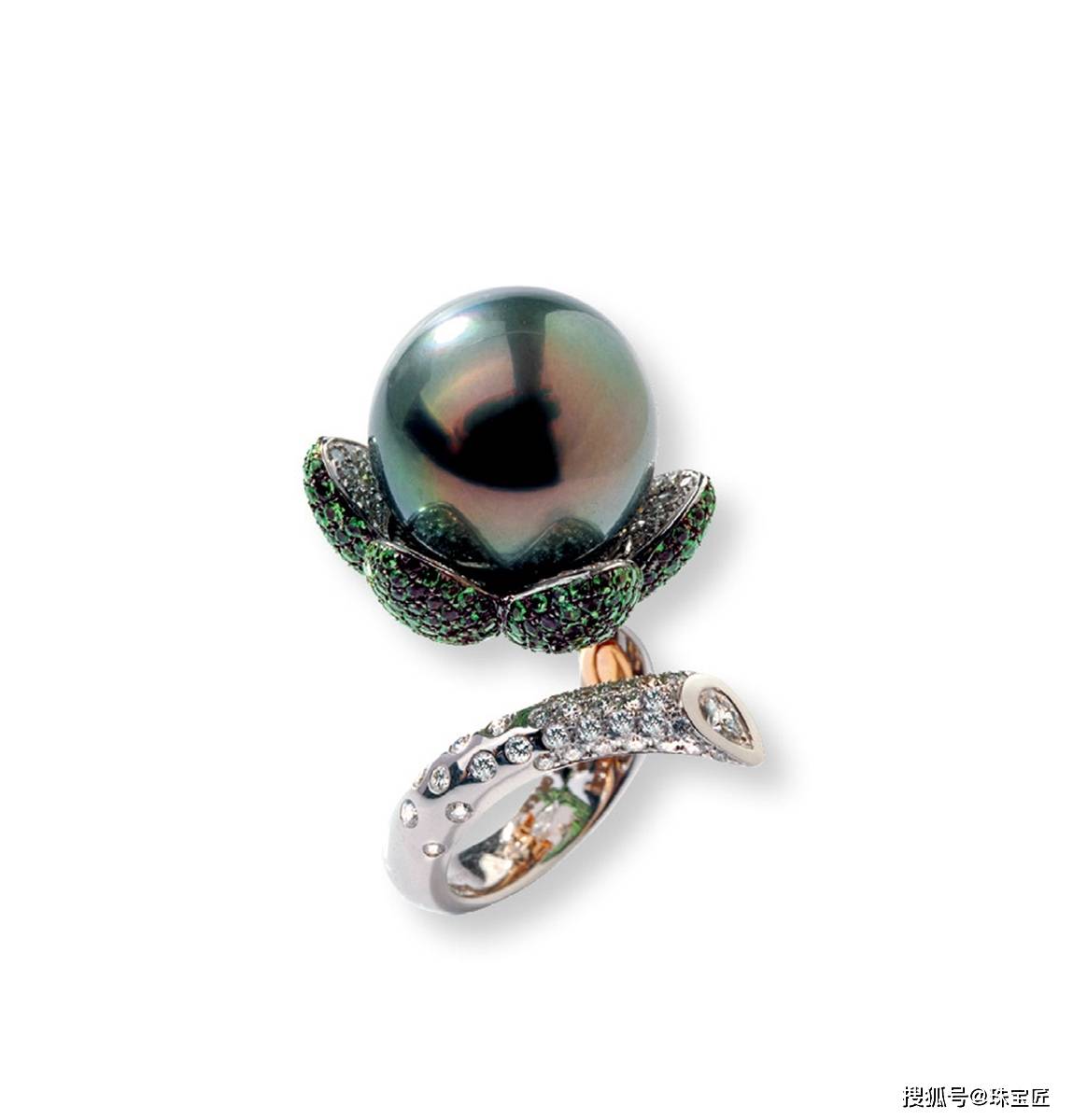 主石是一颗直径16.8mm的大溪地黑珍珠,四周点缀3.29克拉沙弗莱石,戒托以钻石作为点缀,戒圈14.5。