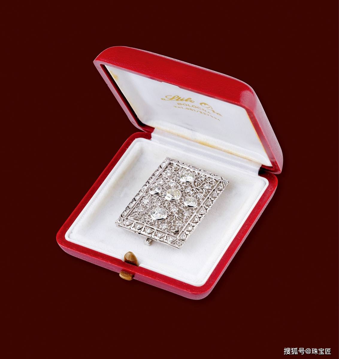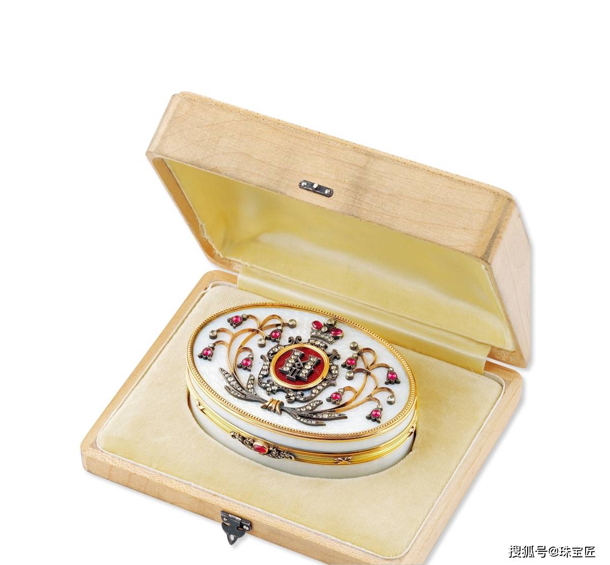 法贝热制作金镶矶鏤工艺首饰盒,采用矶鏤工艺,附法贝热标,皇室礼品红宝石冠,红色矶鏤珐琅带钻石字母,原装木盒,尺寸83×59×28mm,重约194.3克。