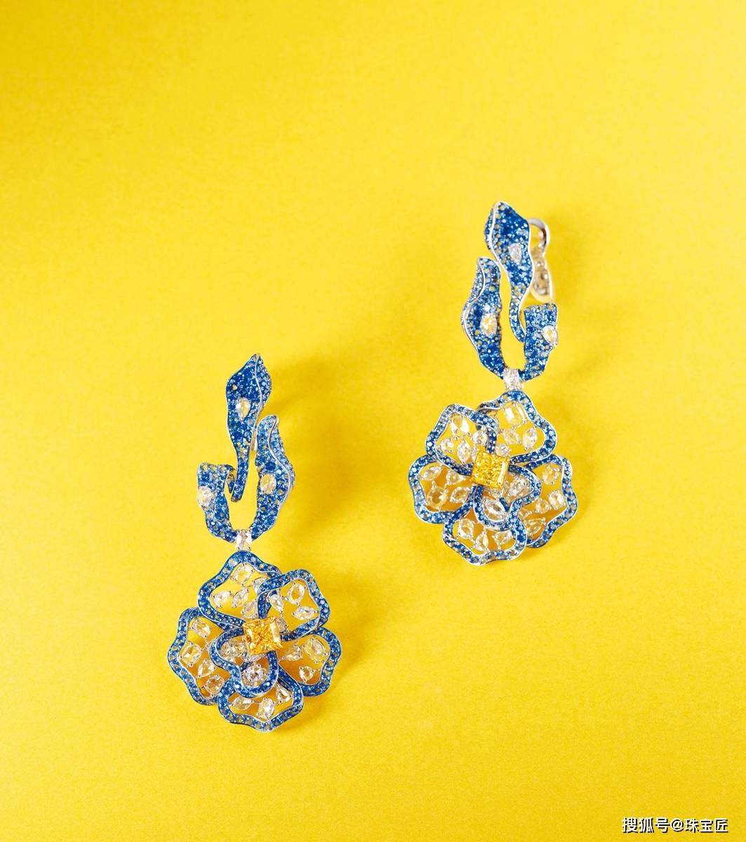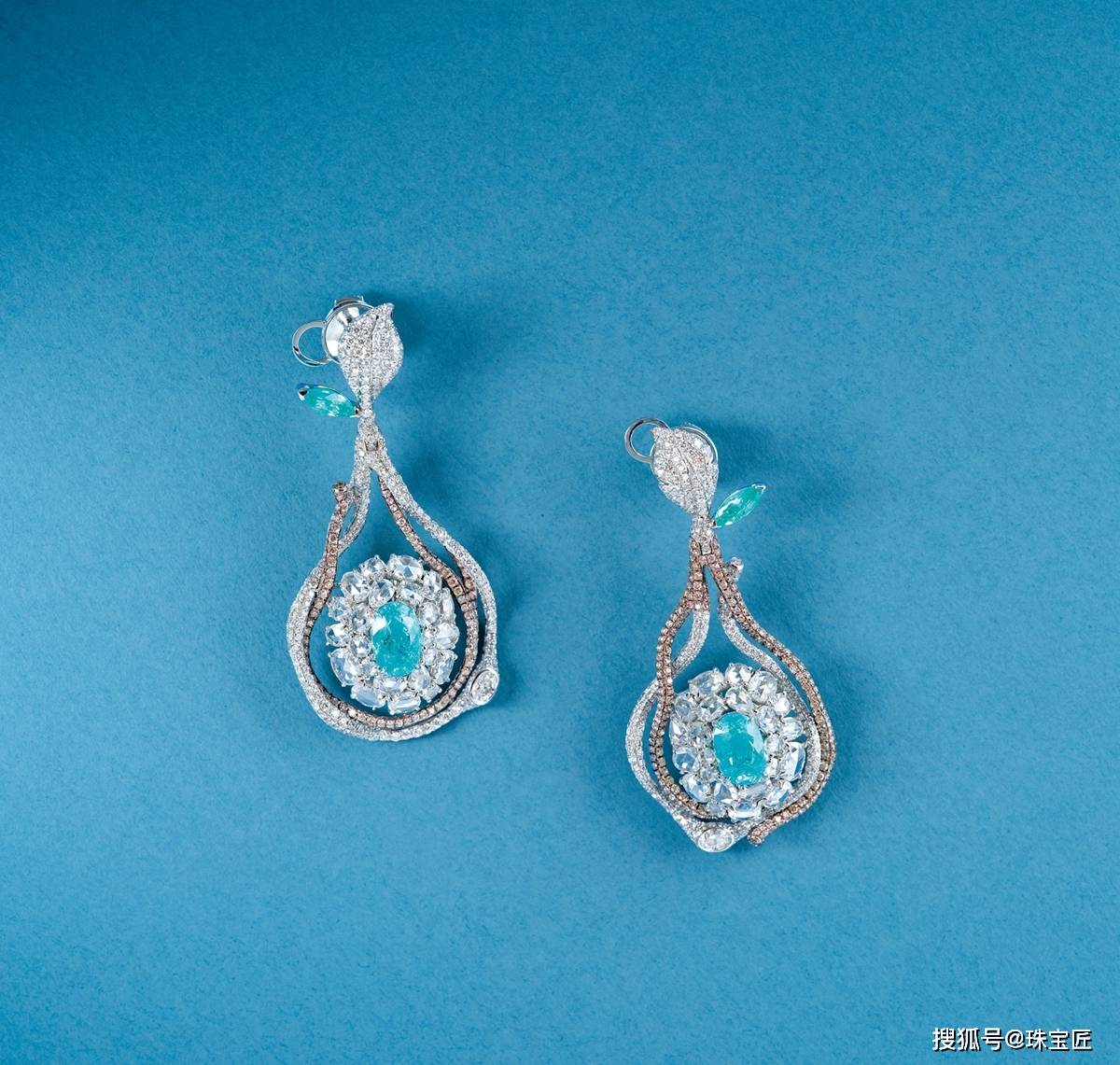 18K金镶2.96克拉帕拉伊巴钻石耳环,花朵造型栩栩如生,色彩明艳,耳环尺寸53.9×25.4mm,总重约25.3克。