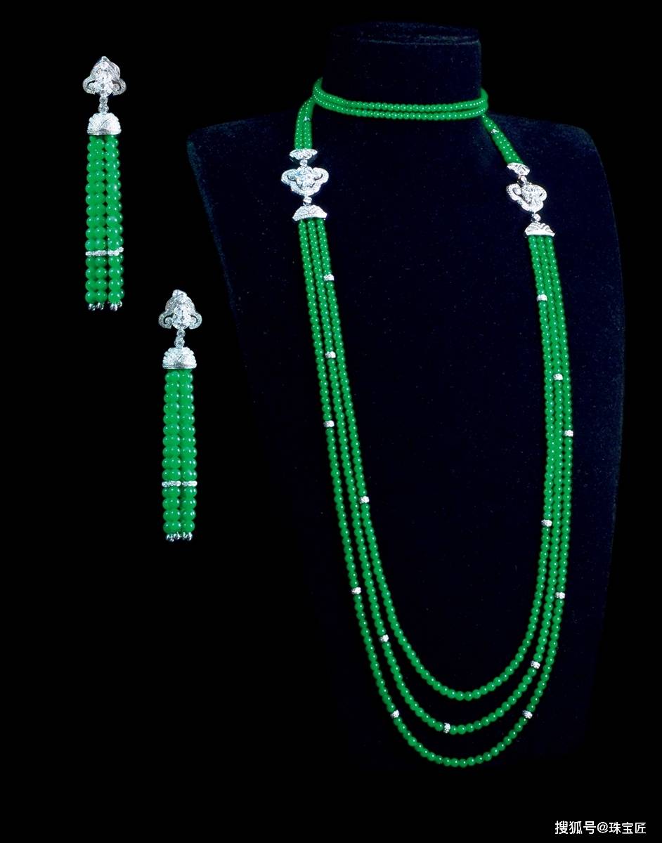 18k金镶满绿珠子项链耳坠套组,重为55.5克,附证书。
