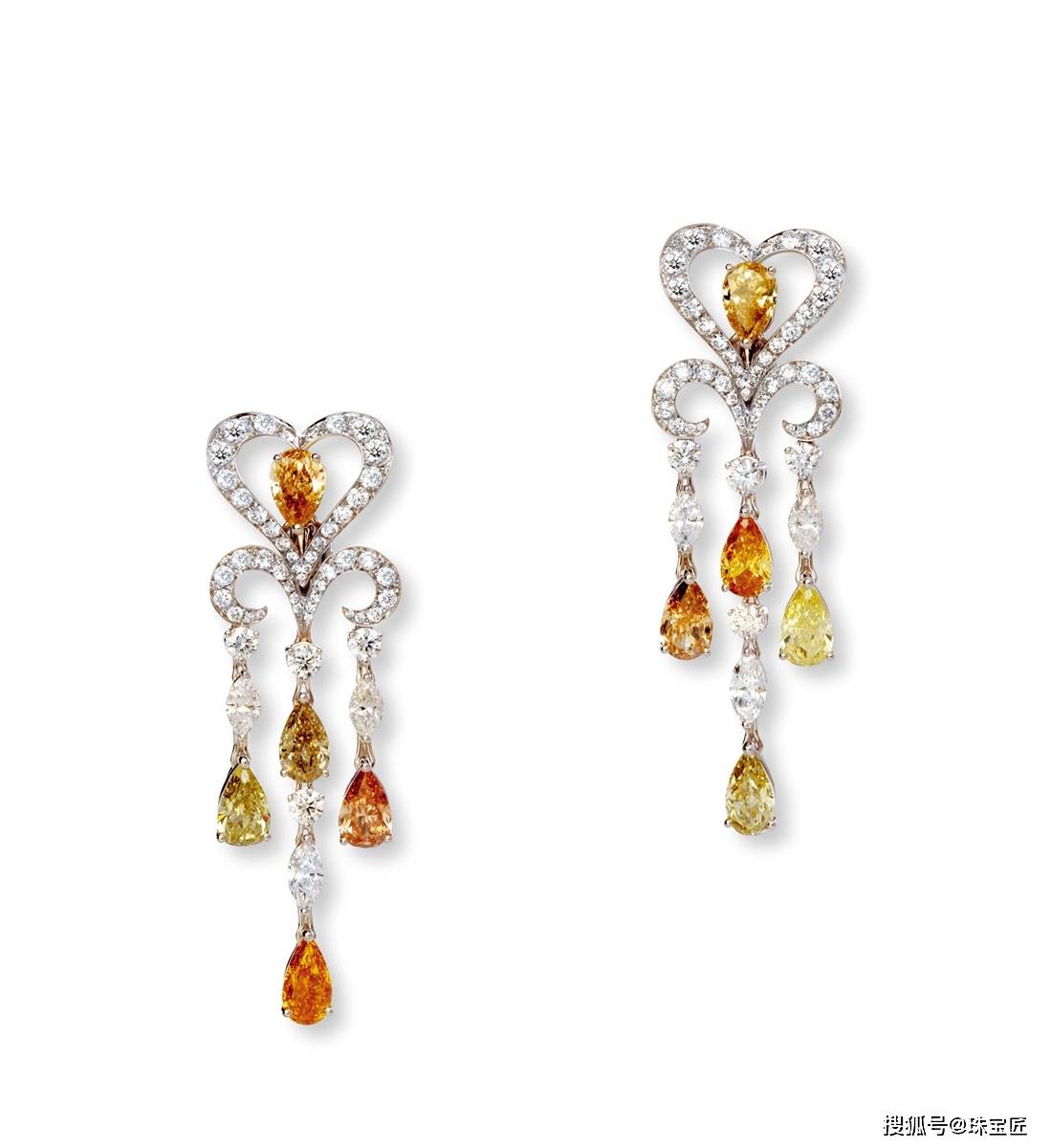 “枝Fancy Chandelier”钻石耳坠,设计师从中世纪的枝形吊灯中获得灵感,选用了10颗颜色各异却又带着复古色调的水滴形彩钻,重现了枝形吊灯的迷人魅力。