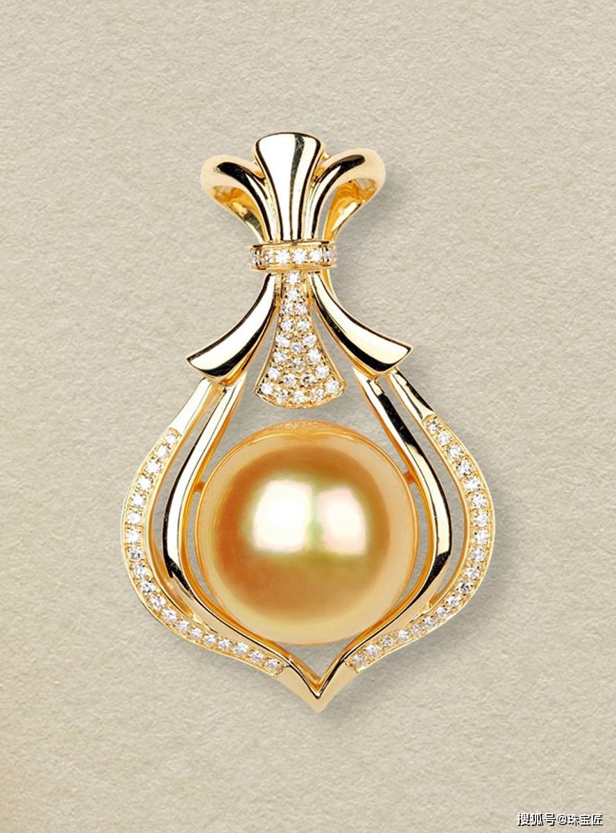 18k金镶海水金珠吊坠,重约9.79克,金珠颜色浓郁,浓金色,尺寸约14.8mm,四周以钻石作为点缀,设计大气典雅。