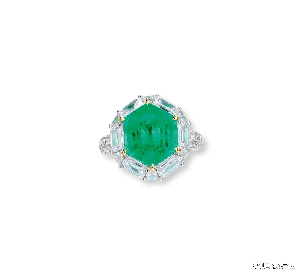 18k镶嵌7.68克拉哥伦比亚木佐矿区祖母绿戒指,色泽浓郁,稀少的菱形刻面玻璃体,四周以6颗D-F色超白亮50分大钻围镶,戒圈14,附证书。