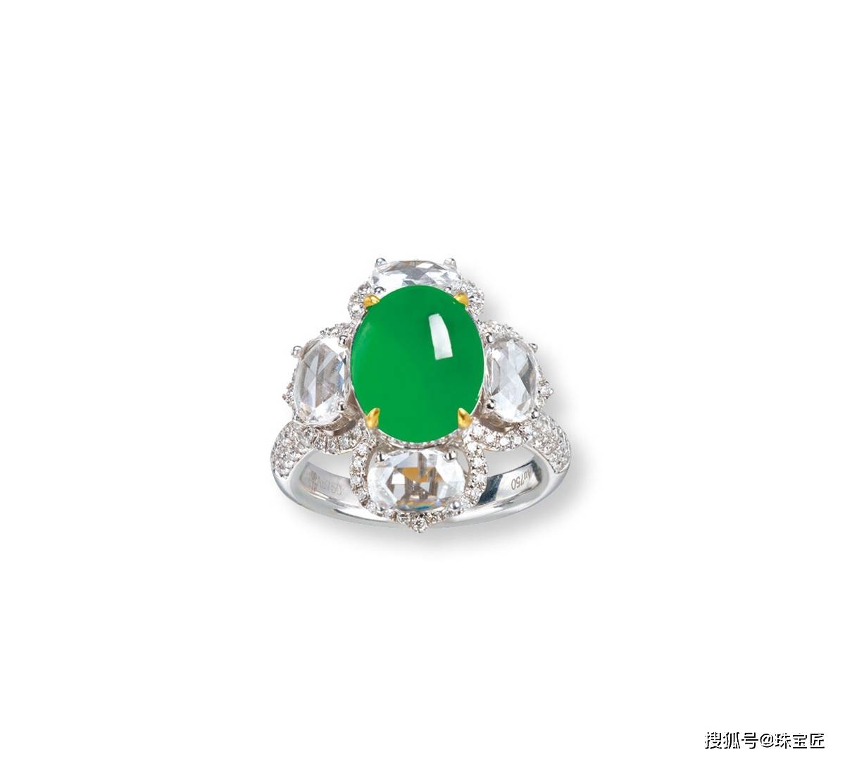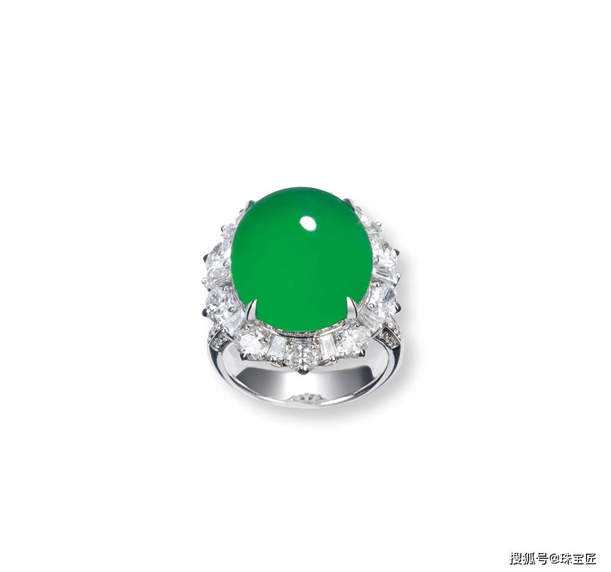 18k金镶阳绿蛋面配钻石戒指,翡翠尺寸约11.4×8.8mm,重约10.4克,戒圈13,附证书。