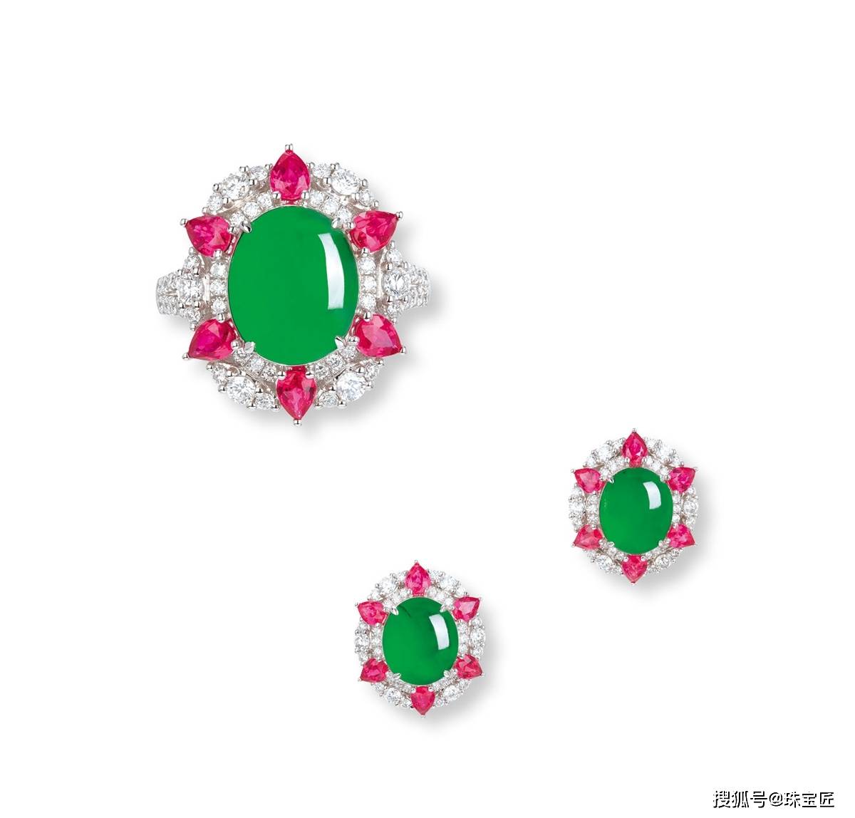 18k金镶冰种翡翠戒指耳钉套组,外圈镶嵌一圈红宝石、钻石,大气典雅,高贵动人,翡翠尺寸11.9×9.7mm,重约9.62克,耳钉翡翠尺寸10.6×9.2mm,重约12.45克,戒圈13,附证书。