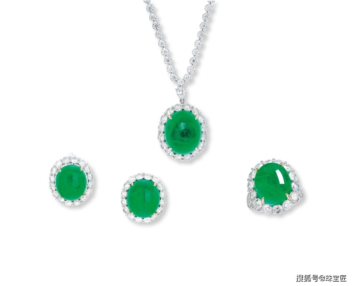 • 70.55克拉微油祖母绿蛋面戒指吊坠耳钉套组