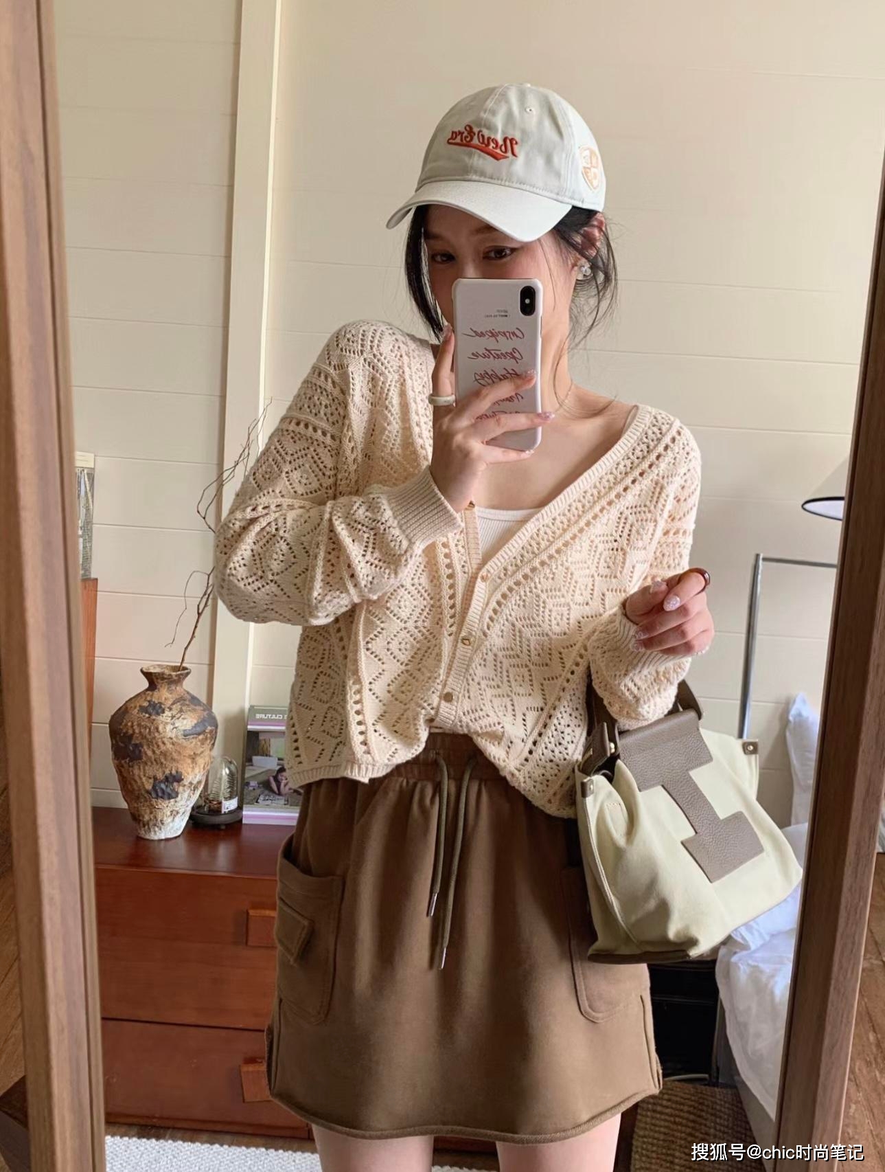 不同亮明度、饱和度的棕色和卡其色混搭,浅卡其色针织外套搭配棕色休闲裙装,打造时尚休闲感。配饰上选择鸭舌帽和小挎包,将中性单品融入,时髦度upupup!