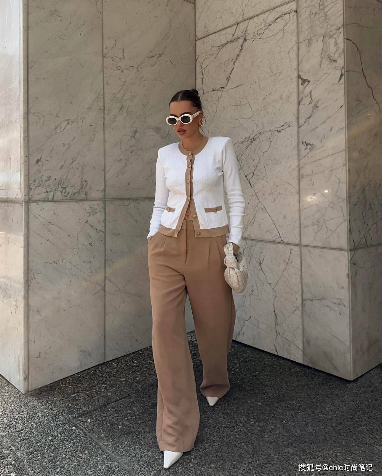 想要穿出高级感,那在色彩上就不能太过花里胡哨,白色针织衫搭配卡其色针织长裤,套装的设计更有统一性,白色针织领口和袖口处也做了卡其色包边,更加和谐高级,这不就是简单的法式穿搭吗!