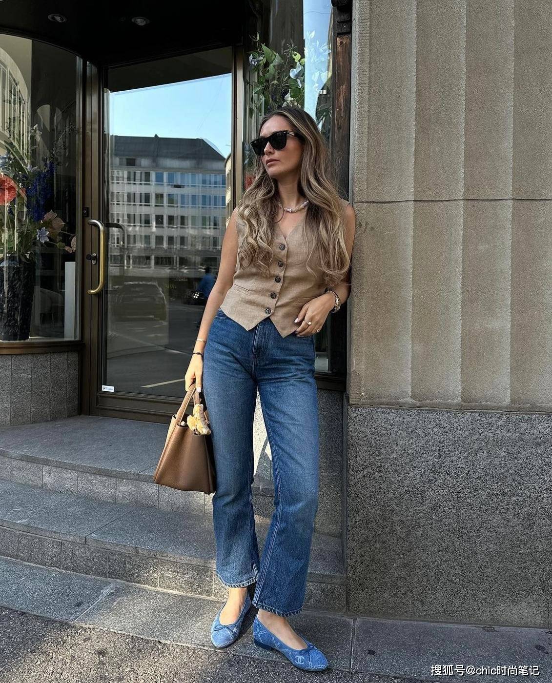 把西装马甲单拎出来也能穿出时尚感,下身搭配复古牛仔裤,配饰上选择一款棕色手拎包,全身上下就两个颜色,但还是让人觉得整个造型非常亮眼吸睛。