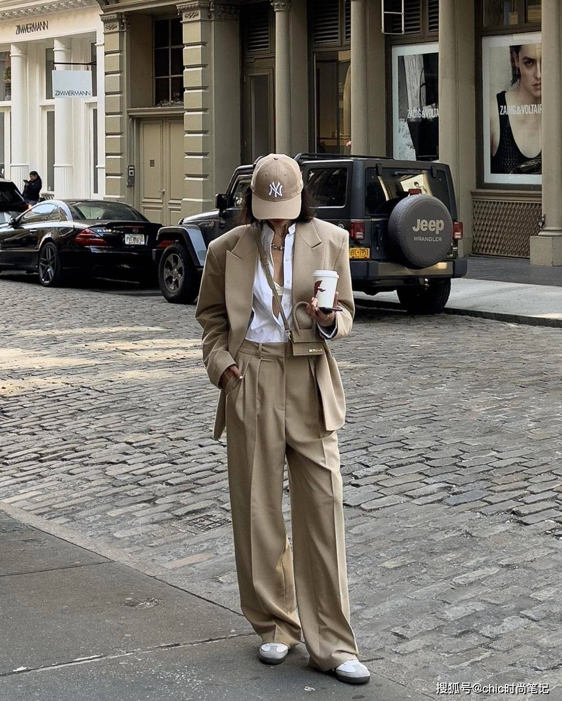 如果想要更加正式但又不那么死板的话,可以选择宽松款式的西服套装,内搭白色衬衫,简约而高级,鞋子不要选择皮鞋,选择运动鞋或者板鞋,让整个造型更加随性、松弛。