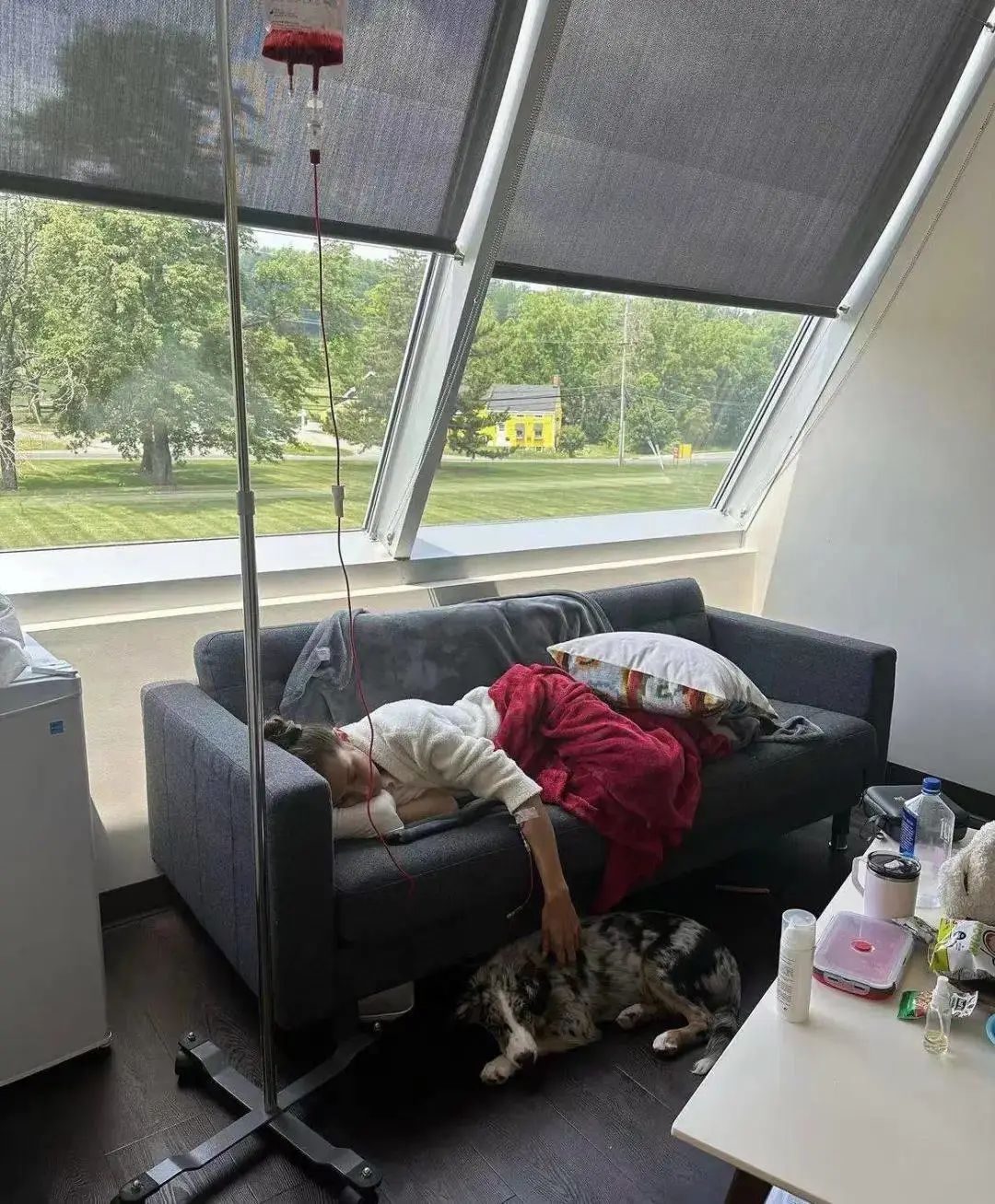 状态更糟糕的时候,完全起不来身的Bella裹着被子,躺在沙发上输血。