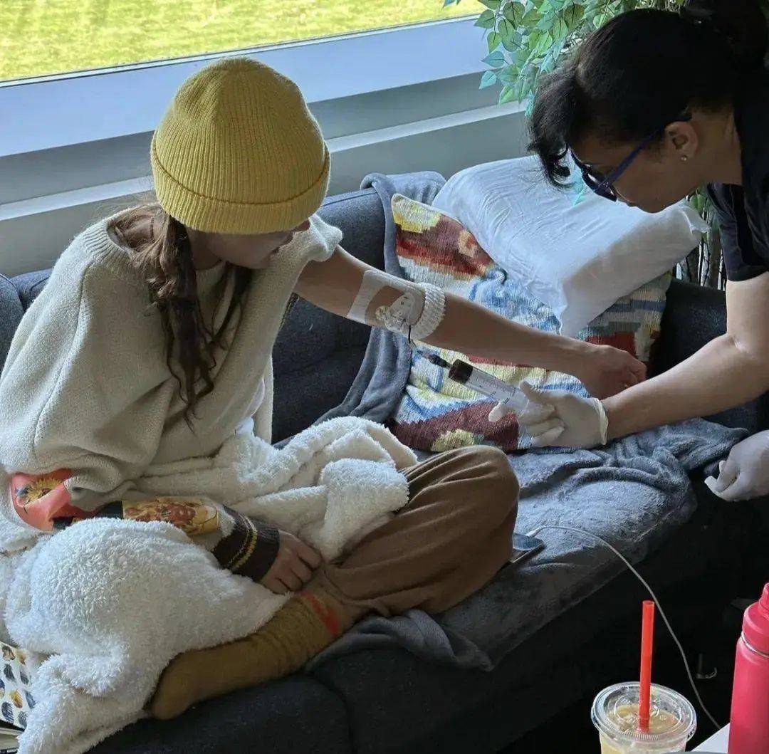 治疗过程看起来也很痛苦,一位护士从她的胳膊上抽血,频繁的抽血注射让她的身体遭受了不小的创伤。