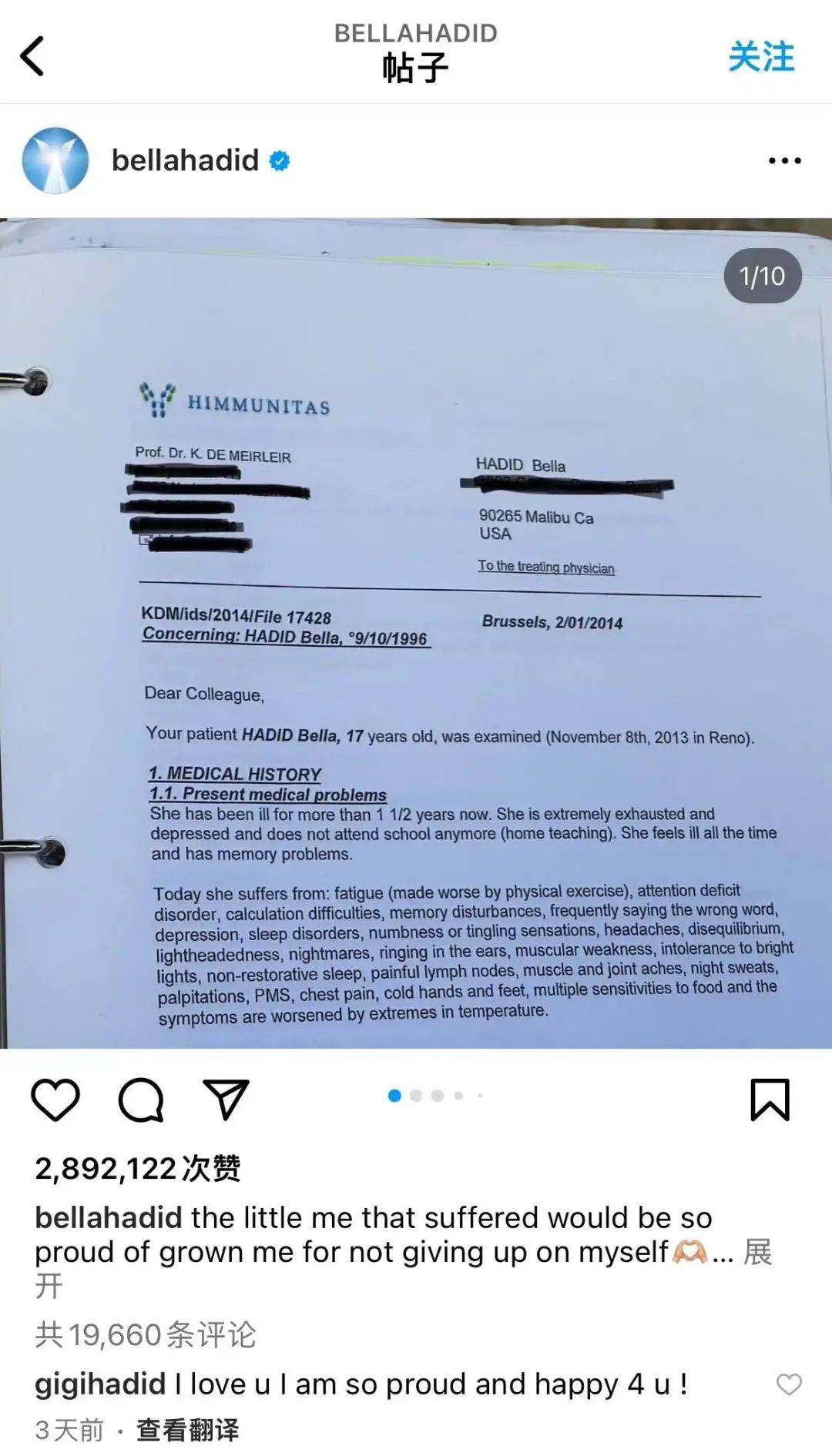 直到3天前,Bella在IG上发长文,第一次跟大家分享了消失的这些天里的经历。