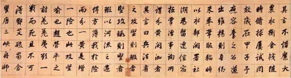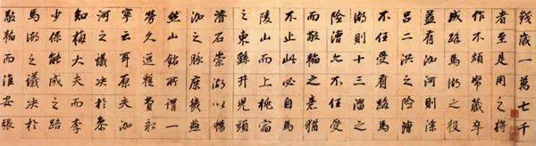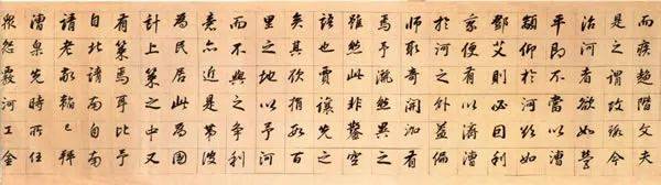 《濬路马湖记》 布局疏朗匀称,是董其昌晚年之作,所谓“渐老渐熟,反归平淡”,寓生秀于扑茂苍拙,自然洒落。董其昌自评曰:“余书与赵文敏较,各有长短。行间茂密,千字一同,吾不如赵;若临仿历代,赵得其十一,吾得其十七。