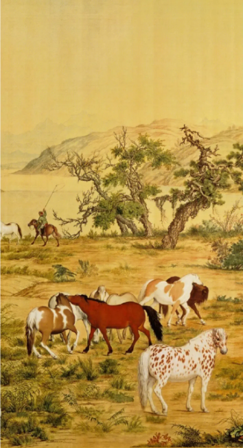 《百骏图》的主角是马,郎世宁颇擅长画马,风格卓然一家,颇有杜甫口中的“须臾九重真龙出,一洗万古凡马空”的境界。