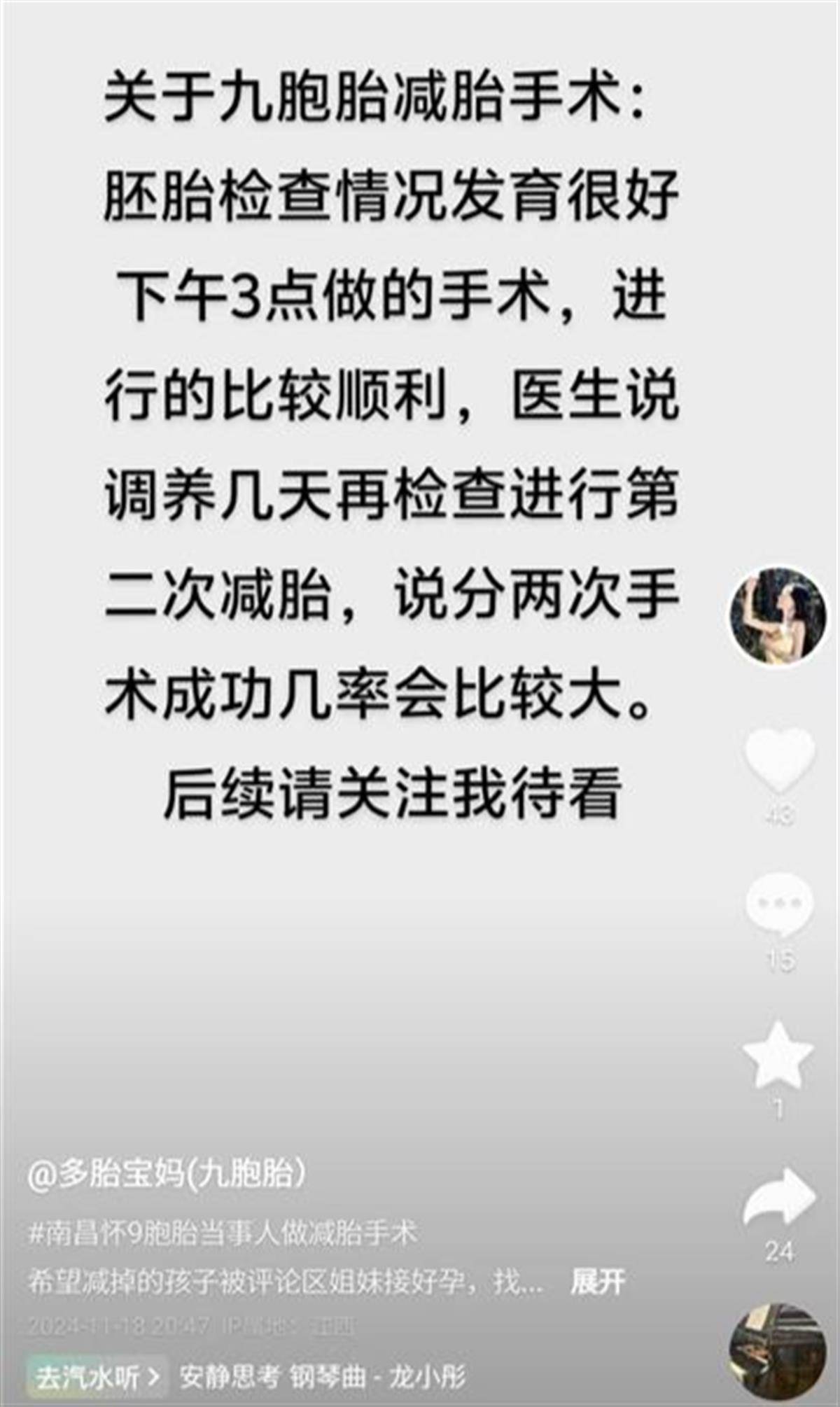 此前11月18日,江西南昌怀上九胞胎的女子在社交平台更新状态说,当天第一次减胎手术比较顺利,医生说调养几天再检查进行第二次减胎。